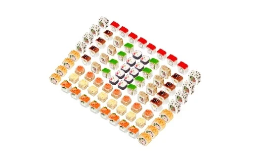 82 шт, Вес 2250 г. Запеченный Филадельфия ШЕФ, запеченный Цыпленок, запеченный 4 сыра, кранч калифорния, филадельфия спешл, калифорния зеленая, калифорния с креветкой, канадский, бонито, окинава.